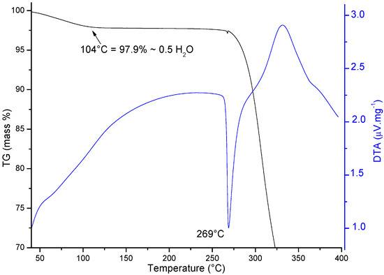 The TG/DTA curves recorded for the Sigma ORBI standard show, as expected, an initial mass loss corresponding to the dehydration (0.5 mol of water per mol of ORBI) of the sample that was shown to be a hemihydrate by the diffraction techniques (Ti = 75 °C; Tf = 104 °C; ΔmTG = 2.1%/Δmcalc. = 2.23%) (Figure 8). Therefore, the molar ratio of 1:2 for water:ORBI was confirmed in the raw material by TG/DTA analysis. The dehydrated product (ORBI anhydrous) is stable up to ~260 °C, at which point its thermal decomposition begins (DTA peak at 269 °C).