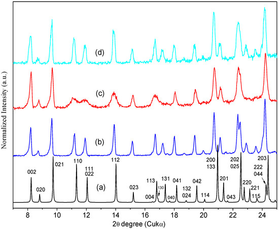 PXRD patterns of ORBI: (a) Calculated from the ORBI hemihydrate form (the Miller indices identifying the Bragg peaks are included); (b) experimental PXRD patterns of Sigma ORBI Standard as received (ORBI hemihydrate form); (c) experimental Sigma ORBI Standard after heating at 200 °C for 10 h (ORBI anhydrous form); (d) Sigma ORBI Standard after heating at 200 °C for 10 h followed by treatment in a climatic chamber at 40 °C with 75% relative humidity during 1 h (rehydrated form = ORBI hemihydrate form). All thermal treatments were ex-situ.