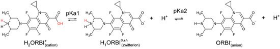 The ORBI molecule has two acid dissociation constants: pKa1 = 5.6 for the 3-carboxylic group, and pKa2 = 8.9 for the 3,5-dimethylpiperazinyl group [7], as shown in Scheme 1. As such, three pH-dependent acid-base species are possible in aqueous media, and depending on the pH, ORBI can be crystallized as a neutral zwitterionic form or as anionic or cationic salts.
