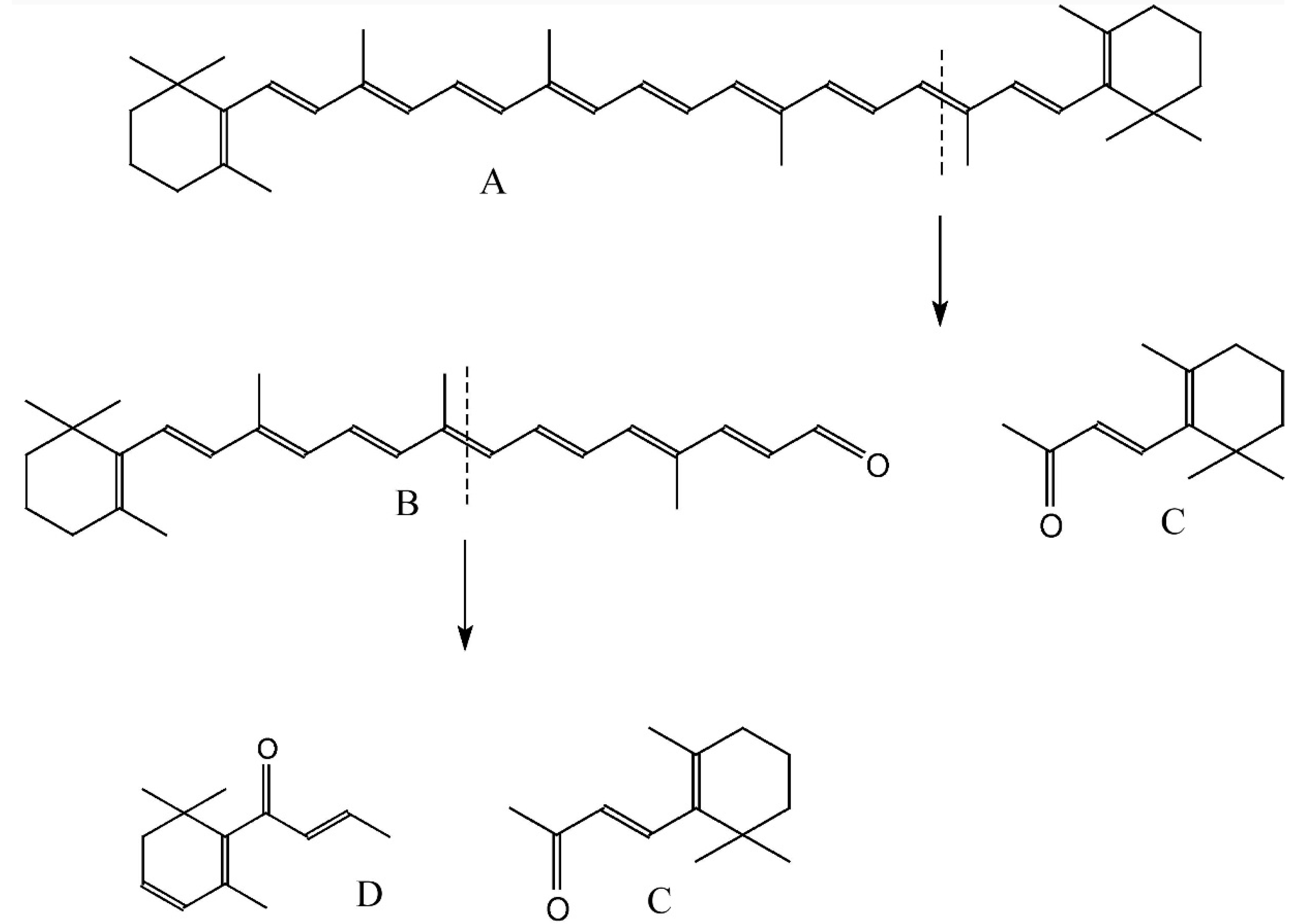 Oxidative degradation of β-carotene: (A) β-carotene; (B) 10’-apo-β-carotenal; (C) β-ionone; (D) β-damascone.