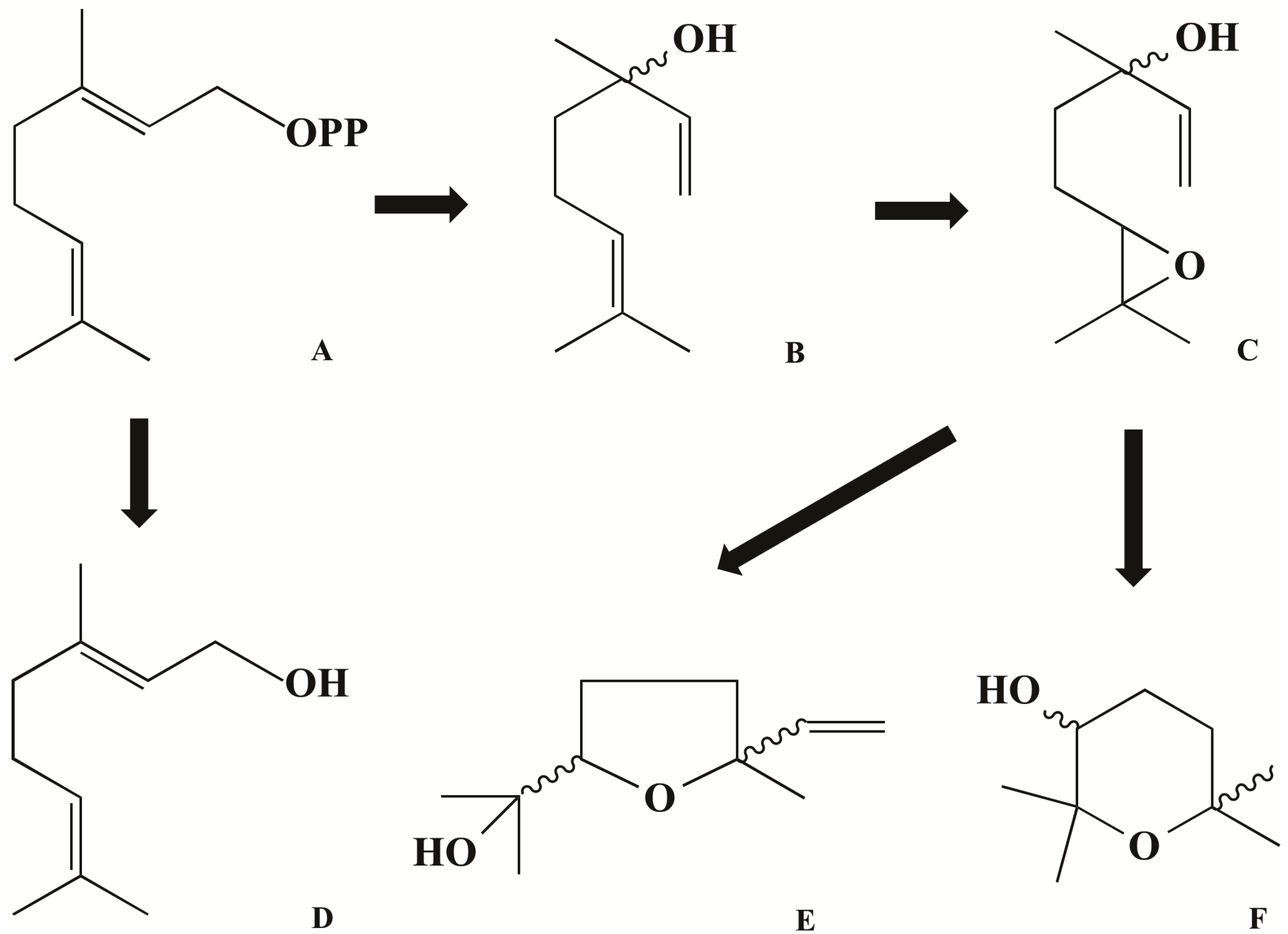 Formation of fatty acid-derived volatiles: (A) geranyl pyrophosphate; (B) linalool; (C) linalool-6,7-epoxide; (D) geraniol; (E) linalool oxide (puranoid); (F) linalool oxide (furanoid).