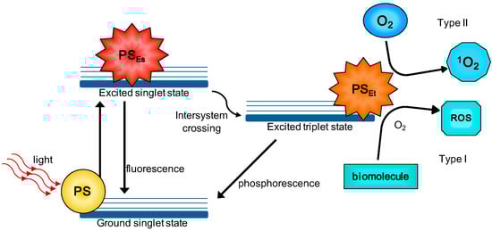 Three components act simultaneously in PDT: a photosensitizer (PS), a light source, and oxygen. The PS and light source must be harmless to the target cell [5]. When the PS is excited by light of a specific wavelength, its interactions with the surroundings can follow two pathways. These pathways are named Type I and Type II reactions, as illustrated in Figure 1. In type I reactions, the PS in its excited triplet state reacts with biomolecules (i.e., lipids, proteins, and nucleic acids), transferring hydrogen atoms via the radical mechanism. It generates free radicals and radical ions (radical type depends on the target molecule, i.e., lipids, proteins, or nucleic acids) that then react with oxygen resulting in reactive oxygen species (ROS) generation [6,7,8,9].