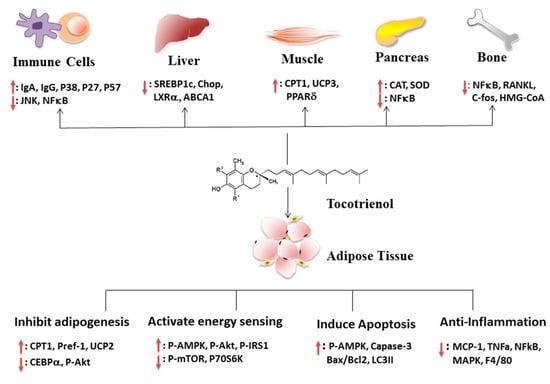 - Burdeos, G.C.; Nakagawa, K.; Abe, T.; Kimura, F.; Miyazawa, T. Tocotrienol modulates crucial lipid metabolism-related genes in differentiated 3T3-L1 preadipocytes. Food Funct. 2014, 5, 2221–2227. [Google Scholar] [CrossRef] [PubMed]