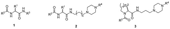 - Zajdel, P.; Subra, G.; Bojarski, A.J.; Duszyńska, B.; Tatarczyńska, E.; Nikiforuk, A.; Chojnacka-Wójcik, E.; Pawłowski, M.; Martinez, J. Novel class of arylpiperazines containing N-acylated amino acids: Their synthesis, 5-HT1A, 5-HT2A receptor affinity, and in vivo pharmacological evaluation. Bioorg. Med. Chem. 2007, 15, 2907–2919. [Google Scholar] [CrossRef] [PubMed]