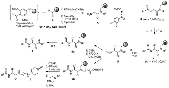 Compounds 1 and 2 can be readily prepared on solid support using BAL-type resins [5,7]. The reactions of this 9- and 12-step synthesis are outlined in Scheme 1.