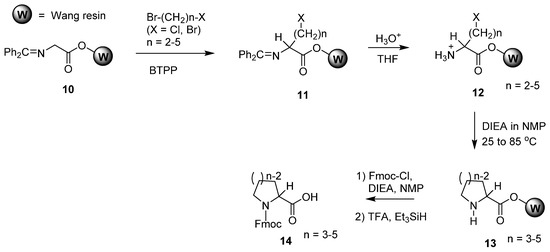 Solid-phase synthesis of proline and homologues from resin-bound intermediate 10 [8,9].