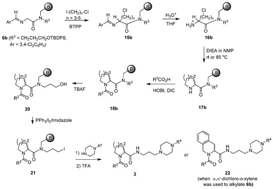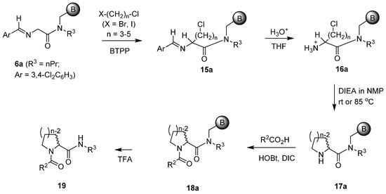Alkylations of the Aldimine of Glycine on BAL Resins 6a or 6b with α,ω-Dihaloalkanes, Subsequent Imine Hydrolysis, and Intramolecular Cyclization: After the resin bound Schiff base 6a or 6b (50 μmol) was washed with CH2Cl2 (3 × 1 mL) and pre-swelled in CH2Cl2 (1 mL) for 1 h, it was washed with NMP (4 × 1 mL). To the resin was added BTPP solutions in NMP (1.0 M, 0.5 mL, 10 eq), followed by addition of I-(CH2)n-Cl (neat, 0.5 mmol, 10 eq, whereas in the case of α,α’-dichloro-o-xylene, its solution in NMP (0.25 mL, 2.0 M, 10 eq) was added). Alkylation was allowed to proceed at room temperature for 24 h with rotation. The alkylated resin product 15a or 15b was washed with NMP (4 × 1 mL), CH2Cl2 (4 × 1 mL), and THF (4 × 1 mL), the resin was then hydrolyzed to afford 16a or 16b using 1N HCl-THF (1:2, 1 mL) over 20 min. After the drained resin was washed with THF (3 × 1 mL), CH2Cl2 (3 × 1 mL), and NMP (3 × 1 mL), it was then treated with 10% DIEA/NMP (1 mL) at ambient temperature for 24 h. The resulting resin bound product 17a or 17b was washed with NMP (4 × 1 mL), THF (3 × 1 mL), and CH2Cl2 (4 × 1 mL).