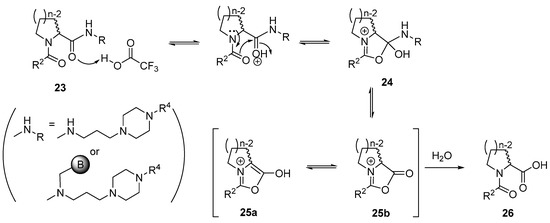 Proposed mechanism for the hydrolysis of proline/proline homologue intermediate products upon treatment with trifluoroacetic acid (TFA).
