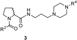 Synthesis of New Proline Amide and Homologue -based Piperazine Incorporated Products 3 and 22 through Acylation, Deprotection, Iodination, N-Alkylation with Piperazines, and Cleavage: After the resin 17b was swelled in CH2Cl2 for 1 h and washed with DMF (4 × 1 mL), it was treated with a pre-mixed clear solution of carboxylic acid (0.25 mmol, 5 eq), HOBt (0.034 g, 0.25 mmol, 5 eq) and DIC (0.032 g, 0.25 mmol, 5 eq) in DMF. The completion of the reaction was indicated by a negative chloranil test [14]. The resulting resin product 18b was then washed with DMF (4 × 1 mL), THF (3 × 1 mL), and CH2Cl2 (3 × 1 mL). After 18b was pre-swelled in CH2Cl2 for 40 min, it was washed with THF (3 × 1 mL), followed by treatment with 1M TBAF/THF (1 mL, 1 mmol, 20 eq) for removal of TBDPS group. After the reaction proceeded for 18 h, the drained resin product 20 was washed with THF (4 × 1 mL), and CH2Cl2 (3 × 1 mL). Iodination of alcohol resin 20 started with its pre-swelling in CH2Cl2 for 1 h, followed by washes with DMF (3 × 1 mL). The resin was then treated with a pre-mixed solution of iodine (0.063 g, 0.25 mmol, 5 eq), PPh3 (0.066 g, 0.25 mmol, 5 eq), and imidazole (0.017 g, 0.25 mmol, 5 eq) in DMF (0.75 mL). The reaction was allowed to proceed at room temperature overnight. After 18 h of iodination reaction, the filtered iodinated resin product 21 was washed with DMF (3 × 1 mL), MeOH (3 × 1 mL), DMF (2 × 1 mL), and CH2Cl2 (3 × 1 mL). The air-dried resin was swollen in CH2Cl2 for 40 min, and to the resin was then added a solution of Piperazines in DMSO (1 M, 0.75 mL, 15 eq) except that 2,3-dichlorophenyl piperazine hydrochloride (0.201 g, 0.75 mmol, 15 eq) was added as the solid together with same equivalent of base DIEA (0.097 g, 0.75 mmol, 15 eq). The reaction was heated to 50 °C for 6 h with occasional agitation. The resulting resin product was drained, and sequentially washed with DMF (2 × 1 mL), MeOH (2 × 1 mL), DMF (3 × 1 mL), and CH2Cl2 (4 × 1 mL). Cleavage with 90% TFA/CH2Cl2 (1 mL) at room temperature over 1.5 h afforded target compound 3a–3d, 22a and 22b.
