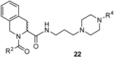 N-(3-(4-(3-Chlorophenyl)piperazin-1-yl)propyl)-2-(cyclopropanecarbonyl)-1,2,3,4-tetrahydroisoquinoline-3-carboxamide (22b): Product 22b was obtained from resin 6b, α,α′-dichloro-o-xylene, cyclopropanecarboxylic acid, and 1-(3-chlorophenyl)piperazine as amorphous white solid (6.0 mg, 25% isolated yield) following chromatographic purification over silica gel with CH2Cl2/MeOH (92:8). Initial LC/MS purity (for crude product) 64%, tR = 7.8 min. 1H-NMR (500 MHz, CD3OD/CDCl3, 1 : 1 mixture of two rotamers): δ 0.87–0.91 (m, 2H), 1.06–1.12 (m, 1H), 1.39–1.44 (m, 2H), 1.59–1.66 (m, 2H), 1.85–1.93 (m, 1H), 1.97–2.05 (m, 2H), 2.68–2.76 (m, 1H), 3.02–3.09 (m, 1H), 3.22–3.28 (m, 2H), 3.32–3.40 (m, 2H), 3.42–2.59 (m, 4H), 3.63–3.71 (m, 1H), 4.86 (d, J = 15.0 Hz, 1H), 4.91–4.94 (m, 0.5H), 4.99–5.05 (m, 1H), 5.05–5.11 (m, 0.5H), 6.78 (dd, J = 8.2 Hz, J = 2.4 Hz, 1H), 6.86–6.89 (m, 1H), 6.91–6.95 (m, 1H), 7.14–7.25 (m, 5H). 13C-NMR (500 MHz, CD3OD/CDCl3): δ 12.2, 13.5, 19.7, 21.4, 23.9, 29.8, 46.5, 46.7, 51.8, 58.8, 114.9, 116.9, 126.3, 127.1, 127.8, 130.5, 133.4, 133.7, 134.0, 135.3, 151.0, 175.3, 176.4. HRMS calcd for [M + H]+: C27H34N4O2Cl 481.2370, found 481.2393.