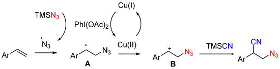 On the basis of the above results, a plausible mechanism is proposed. First, TMSN3 could react with PhI(OAc)2 to generate the N3 radical under the standard reaction conditions. Then the radical addition to alkene gives intermediate A. In the presence of copper(II) catalyst, A could be oxidized to form the intermediate B with a carbocation center, which is trapped by TMSCN to give the final product (Scheme 4).