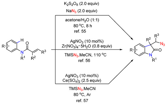 - Wei, X.H.; Li, Y.M.; Zhou, A.X.; Yang, T.T.; Yang, S.D. Silver-catalyzed carboazidation of arylacrylamides. Org. Lett. 2013, 15, 4158–4161. [Google Scholar] [CrossRef] [PubMed]