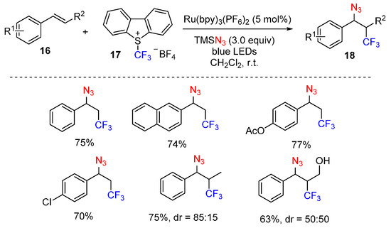 Inspired by their above work, this group also developed a photoredox-catalyzed azidotrifluoromethylation of alkenes 16. Under the optimized conditions, using Umemoto’s reagent as the CF3 source, a wide range of alkenes can be readily difunctionalized (Scheme 12) [61].