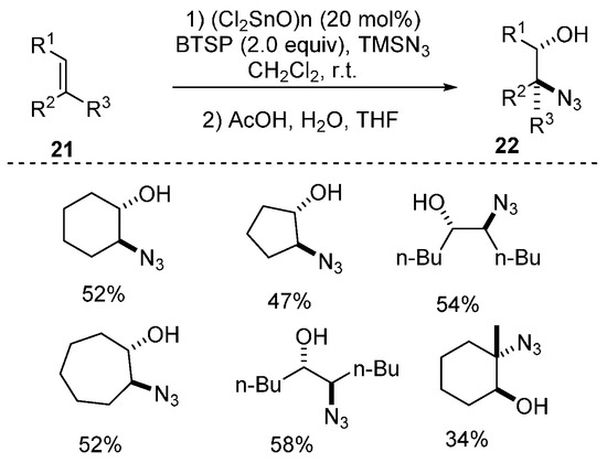 Shibasaki and co-workers reported the first example of (Cl2SnO)n-catalyzed synthesis of trans β-azido alcohols by using readily available alkenes as substrates (Scheme 15) [63].