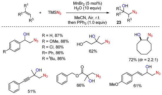 Recently, the Jiao group reported an efficient Mn-catalyzed aerobic oxidative hydroxyazidation of olefins for the synthesis of β-azido alcohols 23 using air as the oxidant (Scheme 17) [64]. This chemistry was notable for its mild reaction conditions, broad substrate scope, and high reaction efficiency. Moreover, the resulting β-azido alcohols are useful precursors of β-amino alcohols, aziridines, and other O- and N-containing heterocyclic compounds.