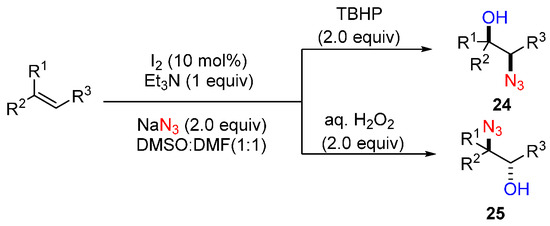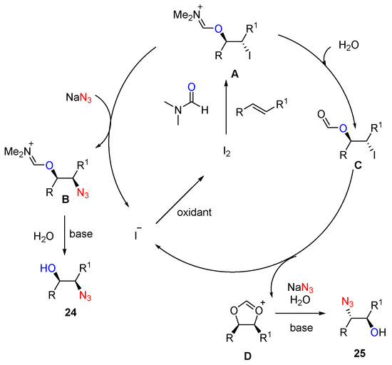 A possible mechanism was proposed (Scheme 20). Firstly, an iodonium ion is formed by the reaction of iodine with alkene, which undergoes subsequent regioselective ring opening with DMF to afford the corresponding iodo intermediate A, followed by stereoselective displacement with NaN3 to give intermediate B. Intermediate B on hydrolysis gives syn azido alcohols 24. Alternatively, under aq. H2O2 conditions, the iodo intermediate A is hydrolyzed in situ to form iodoformate C. The proposed species D is formed from C by the anchimeric assistance from the formate group, it reacts with the azide anion in a regioselective manner to give anti azido alcohols 25 with the liberation of the iodide ion, which is then reoxidized with TBHP/H2O2 to regenerate I2 in the catalytic cycle.