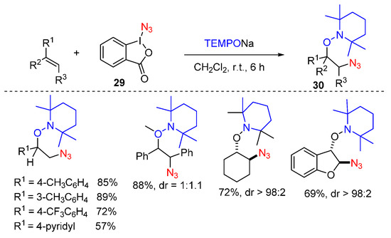 Studer and co-worker achieved oxyazidation reactions of alkenes using sodium TEMPO as O source, reagent 29 as N3 source under mild condition affording product 30 in good yields (Scheme 22) [67]. It is noteworthy that the oxyazidation of cyclic systems proceeded well with excellent diastereoselectivity.