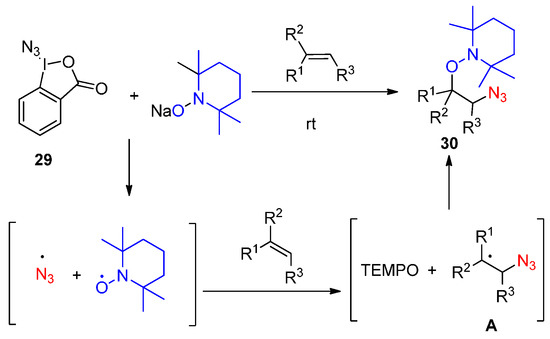 Inspired by their previous work that TEMPONa could reduce CF3-iodine reagent (Togni reagent) to generate CF3-radical [68], a radical process was suggested by the authors (Scheme 23). Under the standard reaction conditions, TEMPONa reduced Togni reagent to generate an N3 radical, and release TEMPO, then the N3 radical is trapped by an olefin to generate species A, which reacts with TEMPO to form products 30.