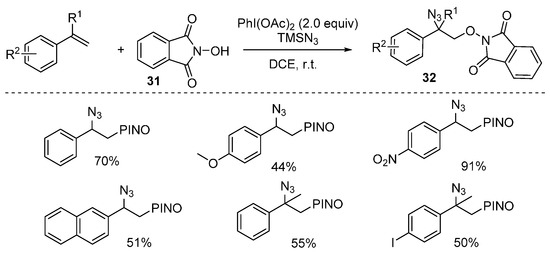 A possible mechanism is outlined in Scheme 25. In the presence of PIDA, N-hydroxyphthalimide (NHPI) 31 could be oxidized to generate an N-oxyl (PINO) radical, which attacks alkenes to form intermediate A. Intermediate A can be further oxidized to cation intermediate B by PIDA. Finally, intermediate B is trapped by TMSN3 to give products 32.