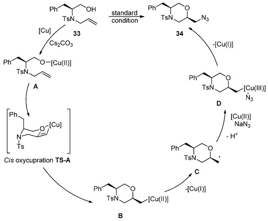 A plausible mechanism is illustrated in Scheme 27. Coordination of alcohol 33 to copper(II) 2-ethylhexanoate gives monomer A. Thermal conditions promote cis-oxycupration via TS-A, then give the copper(II) intermediate B. The diastereoselectivity is rationalized by a chair-like transition state where vicinal tosyl and benzyl substituents adopt pseudoaxial positions. Intermediate B undergoes C-Cu(II) homolytic cleavage to give carbon radical C. In the presence of an azide nucleophile, an organocopper(III) intermediate D is formed, which can undergo reductive elimination to form the product 34.