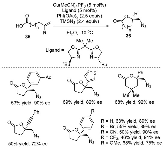A new approach to synthesize a wide range of chiral lactones 36 based on Cu-catalyzed enantioselective radical oxyfunctionalization of alkenes was developed by Buchwald and co-workers [71]. This method provides a straightforward approach to various lactone building blocks containing tetrasubstituted stereogenic centers, which are hard to access through traditional methods (Scheme 28).