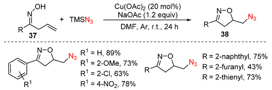 Isoxazolines are useful building blocks in organic chemistry [72]. Recently, an efficient Cu(OAc)2-catalyzed oxyazidation of alkenes 37 was developed by Wang, Xu and co-workers (Scheme 29) [73]. This reaction occurs under mild conditions, forming the azido-substituted isoxazolines 38 in good yields, although the mechanism of this chemistry is still unclear.
