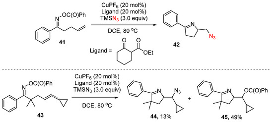 Yu and co-workers reported an intramolecular azidation reaction through copper-mediated N-O cleavage and subsequent C-N bond forming 5-exo cyclization. The forming intermediate is subsequently azidated to afford the corresponding dihydropyrroles (Scheme 31) [75]. To understand this reaction mechanism, compound 43 was treated under standard reaction conditions. However, in this case 44 and 45 are mainly obtained with only trace amounts of ring opening product formation, suggesting that the cyclization step is unlikely a free radical process. Based on these results, a reaction mechanism is proposed (Scheme 32). The first step involves the oxidative addition of Cu(I) to the N-O to give intermediate A, which undergoes ligand exchange and then intramolecular cyclization to afford intermediate C, followed by reductive elimination to afford products 42.