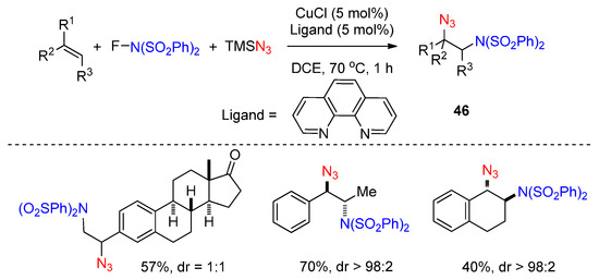 Studer and co-workers described a novel methodology for the efficient synthesis of the precursors of vicinal amino azides 46 (Scheme 33) [76], which can easily be transformed into other important amine derivatives. This chemistry employed Cu(I) as catalyst, TMSN3 as N3 source and available N-fluorobenzenesulfonimide (NFSI) as nitrogen-radical precursor leading to the desired products in moderate to excellent yields with high diastereoselectivity.