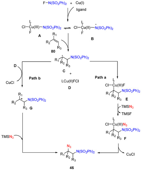A plausible reaction mechanism based on the reported processes is outlined in Scheme 34 [77,78]. Firstly, Cu(I) reacts with NFSI to form Cu(III) species A, which could exist in equilibrium with a Cu(II)-stabilized N-centered radical B. It is the precursor of bis-sulfonylamidyl radical, which adds to the alkene to generate carbon radical C and Cu(II) species D. Also B species could react as N-radicals with the alkene. Then two pathways are suggested. In path a, trapping of C with D provides Cu(III) species E, which exchanges ligand with TMSN3 to give Cu(III) complex F. Reductive elimination of F affords the products along with the regeneration of the Cu(I) catalyst. In path b, D oxidizes C to cationic intermediate G, which is trapped by TMSN3 to form the products.