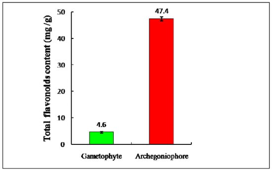 The total flavonoids contents in the gametophyte and archegoniophore of M. polymorpha L. were determined as 4.62 ± 0.24 mg/g and 47.42 ± 0.76 mg/g, respectively (Figure 1), showing that the otal flavonoids content of the archegoniophore was ten times as haigh as that of the gametophyte.