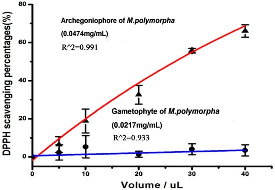 The DPPH free radical scavenging potential of the gametophyte and archegoniophore of M. polymorpha L. (n = 3).