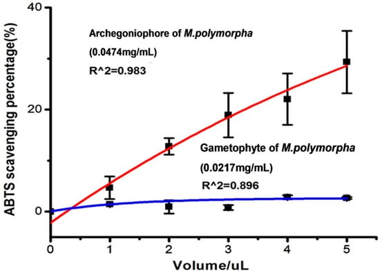 The ABTS·radical scavenging potential of the extracts from the archegoniophore of M. polymorpha L. increased with increasing volume from 1.0 to 5.0 μL (Figure 3). Furthermore, the gametophyte extracts of M. polymorpha L. showed a lower scavenging ability than that of the archegoniophore. The IC50 of the archegoniophore extract was 3.0 μg/mL.