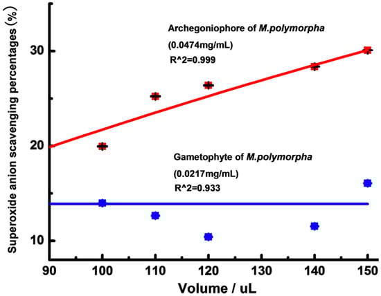 The superoxide anion scavenging activity of the extracts from the archegoniophore and gametophyte of M. polymorpha L. is shown in Figure 4. With the increasing volumes from 100 to 150 μL, the superoxide anion scavenging potential of the extracts from the archegoniophore increased slightly, while the extracts from the gametophyte of M. polymorpha L. hardly showed any superoxide anion scavenging activity.