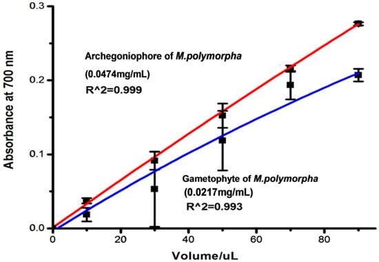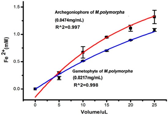 The FRAP assay was used to measure the antioxidant and reductive capacity of the extracts from the archegoniophore and gametophyte of M. polymorpha L. (Figure 6). The results illustrated that the extracts from the archegoniophore and the gametophyte of M. polymorpha L. both possessed antioxidant and reductive activity. With the increasing volume, the antioxidant and reductive capacity improved. Within the range of 5 to 25 μL, the activity of the extracts from the archegoniophore was stronger than that of the gametophyte.