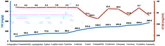 The extracts with higher concentrations of total flavonoids usually showed stronger DPPH radical scavenging activity []. Here, the extracts from the archegoniophore showed higher total flavonoid content and stronger free radical scavenging activity. Although the archegoniophore results support the above viewpoint, the total flavonoids concentrations and DPPH radical scavenging activity IC50 values from this work were compared with those reported for other fern species, the orders from left to right were archegoniophore, Pyrrosia nummulariifolia, Athyrium pachyphyllum, Hicriopteris glauca, Adiantum capillus-veneris, Pyrrosia petiolosa, Araiostegia imbricata, Selaginella tenera, Selaginella inaequalifolia, Dryopteris erythrosora, Dryoathyrium boryanum, Selaginella involvens, Selaginella intermedia (Figure 7) [,,]. The higher flavonoids content did not always show a positive correlation with the antioxidant activity.
