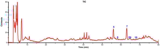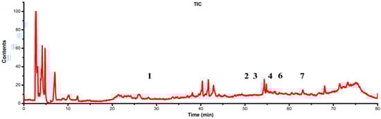 The LC-DAD-ESI/MS instrument consisted of an Agilent 1100 HPLC equipped with a diode array detector and an Agilent mass spectrometer (LC/MSD SL) (Agilent Technologies, Santa Clara, CA, USA). A Symmetry column (C18, 250 × 4.6 mm, 5 μm) (Waters, Milford, MA, USA) was used at a flow rate of 1.0 mL/min. The column oven temperature was set at 25 °C. The mobile phase consisted of 0.2% formic acid (A) and acetonitrile (B) with the following gradient program: 0–10 min, 5% B; 10–15 min, 5%–15% B; 15–25 min, 15% B; 25–35 min, 15%–25% B; 35–40 min, 25% B; 40–50 min, 25%–35% B; 50–60 min, 35% B; 60–70 min, 35%–50% B; 70–80 min, 50%–5% B. The flow-rate was kept at 0.30 mL/min. The DAD was set at 254 nm to provide real time chromatograms and the UV/Vis spectra from 190 to 650 nm were recorded for plant component identification. Mass spectra were simultaneously acquired using electro-spray ionization in the positive (PI) and negative ionization (NI) modes, at low (70 V) and high fragmentation voltages (250 V) for both ionization modes. For brevity, the high and low fragmentation voltages of the PI and NI modes will be identified as PI250, PI70, NI250, and NI70 in the text. The mass spectra were recorded for the range of m/z 100–1000, a drying gas temperature of 350 °C, a nebulizer pressure of 50 psi, and capillary voltages of 4000 V for PI and 3500 V for NI, were used. The LC system was directly connected with MSD without stream splitting [].