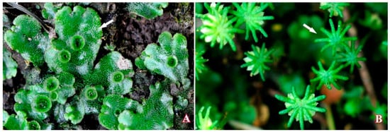 Gametophyte (A) and archegoniophore (B) of M. polymorpha L.