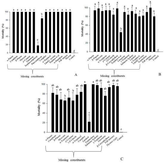 Fumigant toxicities of hyssop (A); majoram (B); Thymus zygis oil (C), a full mixture, and selected blends of the constituents in rice weevil adults with 48 h of treatment. The concentration of hyssop, majoram, and Thymus zygis oil was 12.5 mg/L air. The concentrations of the full mixture of hyssop, majoram, and Thymus zygis oil were 9.86, 9.74, and 10.34 mg/L air, respectively. The concentrations of the other blends were determined by removing each constituent equivalent to the ratio identified in hyssop, majoram, and Thymus zygis oil. Mean values corresponding to each treatment with different letters are significantly different from each other (hyssop oil: F15,64 = 774.92, p < 0.0001; majoram oil: F17,72 = 38.125, p < 0.0001; Thymus zygis oil: F17,72 = 37.70, p < 0.0001; Scheffé’s test).