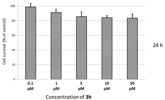 Viability of human neuroblastoma SH-SY5Y cells incubated for 24 h with Compound 3h at different concentrations (range 0.1–50 μM). Untreated cells were used as the control. Results are expressed as the percentage of viable cells observed after treatment with Compound 3h vs. untreated control cells (100%) and shown as the mean ± SD (n = 3).
