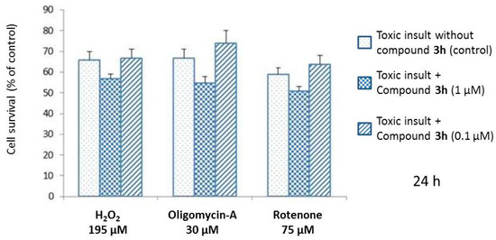 Neuroprotection effect of 3h on the viability of human neuroblastoma SH-SY5Y cells. Viability was measured after 24 h co-incubation of SH-SY5Y cells with the neurotoxic insult (H2O2 195 μM, oligomycin-A 30 μM or rotenone 75 μM) and Compound 3h at different concentrations (1 µM and 0.1 µM) or in the absence of 3h (control experiments). Results are expressed as the percentage of viable cells, and data represent the means ± SD (n = 3).