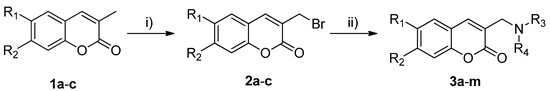 Synthesis of coumarins 3a–m. Reagents and conditions: (i) N-bromosuccinimide, benzoyl peroxide, CCl4, reflux, 2–7 h; (ii) suitable amine, triethylamine (for 3a,b, 3d–e, 3g, 3l–m) or K2CO3 (for 3c, 3f, 3h–k), DMF at 70 °C (for 3a, 3l–m) or THF at room temperature (3b–k), 3.5–24 h.