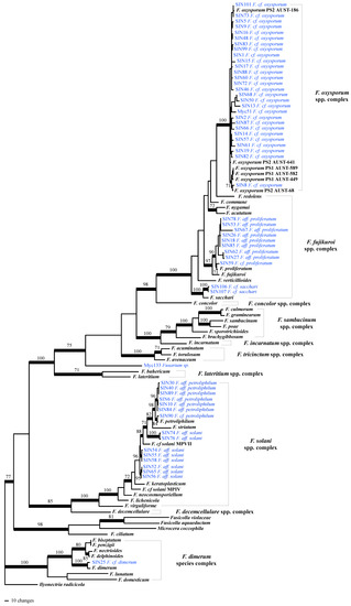 One of the most parsimonious trees (length = 4200 steps, consistency index = 0.2623, homoplasy index = 0.7373) inferred by analysis of 5-locus/104 taxa dataset. Branches that received significant bootstrap support (≥ 70%) are in bold. Strains phylogenetically analyzed for this study are highlighted blue. Abbreviations used: F.: Fusarium; cf. refers to taxa that were likely to be the same species, aff. (for affinity) refers to less closely related taxa, supported to be different from a named species, or to taxa that were not monophyletic with any named species in the F. solani spp. complex .
