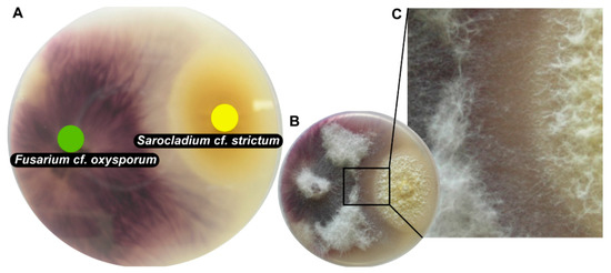 Picture of co-culture of Fusarium cf. oxysporum SIN17 and Sarocladium cf. strictum SIN29 grown on solid medium in 9-cm Petri dishes. (A) shows the bottom view of the co-culture with F. cf. oxysporum on the left (green dot) and S. cf. strictum to the right (yellow dot); (B) shows the top view of the co-culture; (C) shows a close-up view of the altered mycelial growth in the interaction zone between the two fungi.