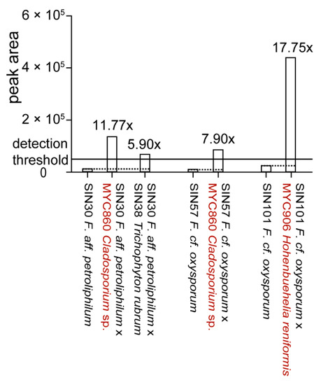 To determine if Fusarium strains that did not produce significant amounts of fusaric acid in pure culture were able to produce it in co-culture, 106 co-cultures including Fusarium spp. [26] were analyzed for fusaric acid production. De novo induction of fusaric acid could be observed in four co-cultures (Figure 6).