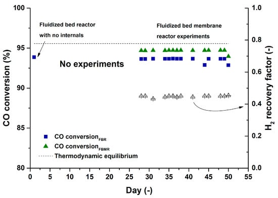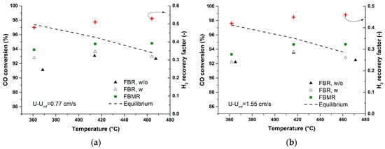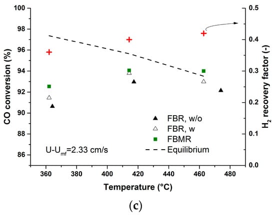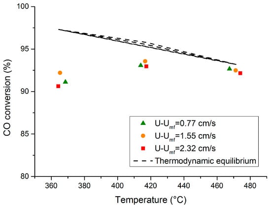 Figure 2 illustrates the performance of the catalytic fluidized bed reactor (without membranes) at different temperatures and at different excess velocities (i.e., different U-Umf values, where U is the fluidization velocity and Umf the minimum fluidization velocity) to have a similar initial equivalent average bubble size at different temperatures. According to the obtained results, the performance of the reactor was mainly limited by thermodynamics, where a CO conversion close to the equilibrium value was achieved, especially at higher temperatures. In addition, at constant temperature, the performance of the reactor was similar for different excess velocities, since the CO conversion is not limited by the mass exchange rate between the emulsion and the bubble phases. Therefore, increasing the inlet flow rate will not result in higher CO to H2 conversion rates.
