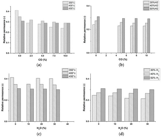 The poisoning effect of CO was quantified by adding different percentages of CO (2.5%–10%) to a mixture of H2 and N2 with different compositions and at different temperatures (N2 was used as the balance). Inspecting the obtained results shown in Figure 3a,b, it can be inferred that, for all cases, CO had a poisoning effect on the performance of the membranes. It can be seen that the poisoning effect of CO is more pronounced at lower CO concentrations. This is in line with the current knowledge on CO interaction with the membrane surface. In fact, CO can easily jump between the hollow and the bridge positions of the Pd cluster, and this permits a small amount of CO to inhibit the interaction of H2 with a large part of the Pd surface [26]. At higher temperatures, a less pronounced CO poisoning effect was also observed, as has already been reported by many authors [27]. The possible inhibitory effect of H2O on the performance of the membrane was studied as well by addition of certain percentages of H2O (30%–50%) to a mixture of H2 and N2 with different compositions and at a temperature range of 350–450 °C (Figure 3c,d). The addition of H2O had a negligible effect on the hydrogen permeance of the membranes.