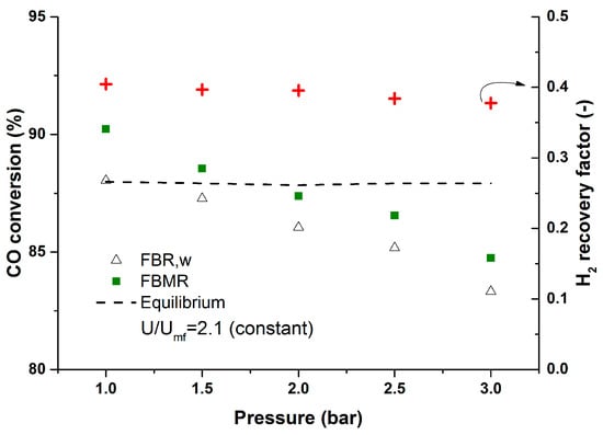 Effect of pressure on the performance of the membrane reactor at constant U/Umf at 400 °C, CO (10%), H2O (15%), N2 balance, Ppermeate: 30 mbar.