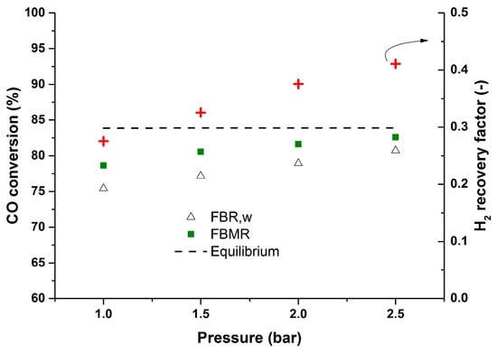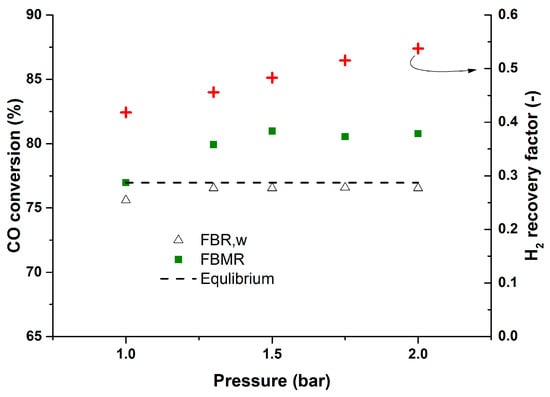 The membrane reactor performance was also studied by feeding a semi-industrial WGS feed composition (WGS gas as outlet of a steam methane reformer) at different pressures. The inlet flow rate was kept the same for all the cases to keep the ratio of the inlet flow rate to the membrane area constant, as in the previous study. The obtained results (Figure 9) confirmed the better performance of the membrane reactor at higher pressures, although the maximum total pressure was 2 bar due to limitations with the current setup. The CO content in the permeate is below 10 ppm (average CO impurity: 5.6 ppm, min: 4.5 max: 7 ppm), which guarantees the H2 quality for fuel cell applications.