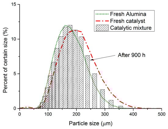 Particle size distribution of fresh alumina, catalyst and the catalytic batch after 900 h of continuous operation (FRITSCH ANALYSETTE 22).