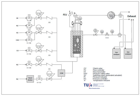 The reactor was constructed with a geometry of 102 mm in diameter and 100 cm in height from AISI310 (CORO METAALTECHNIEK, Veenendaal, The Netherlands). The porous plate distributor was made of Hastelloy X (Ø 102 × 5 mm) with 40 µm pore size. Three electric baby ovens with a capacity of 2.2 kW were used to keep the reactor at the desired temperature. Pressure transmitters (PTX 1400 from Druck Nederland B.V., The Netherlands) were used to measure the pressure at the top and bottom of the reactor (at the porous plate position). The feed can be set to bypass the reactor using a three-way valve (Parker type) to measure the composition with an analyzer.